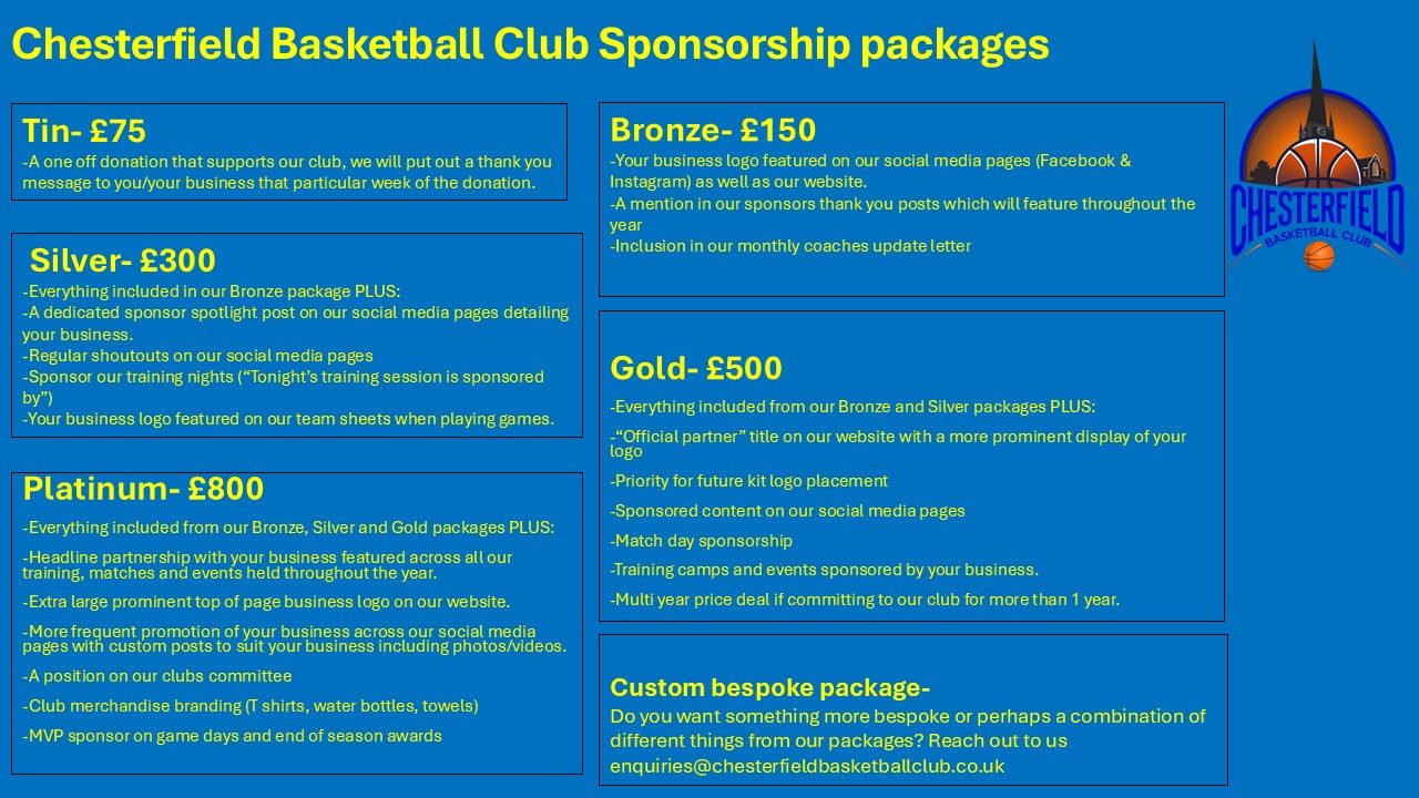 Chesterfield Basketball Club are on the lookout for sponsors and have a wide range of different packages on offer including a custom bespoke package that can be tailored to what you or your business wants.